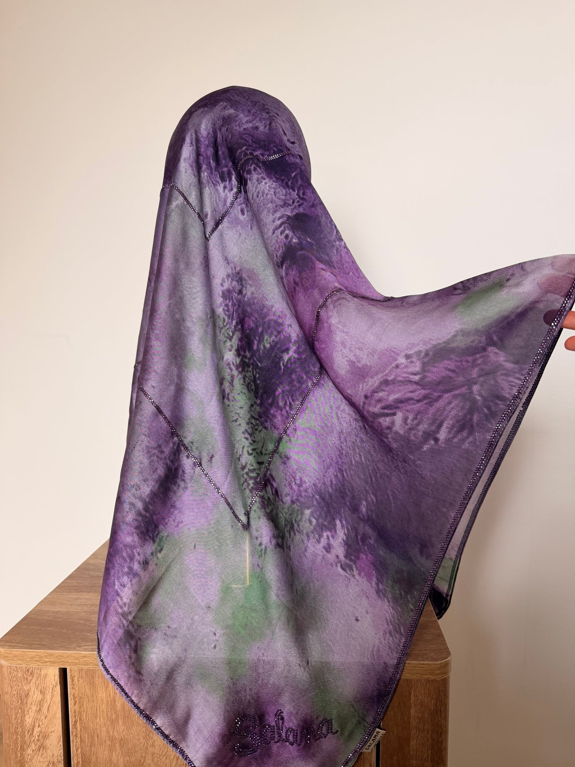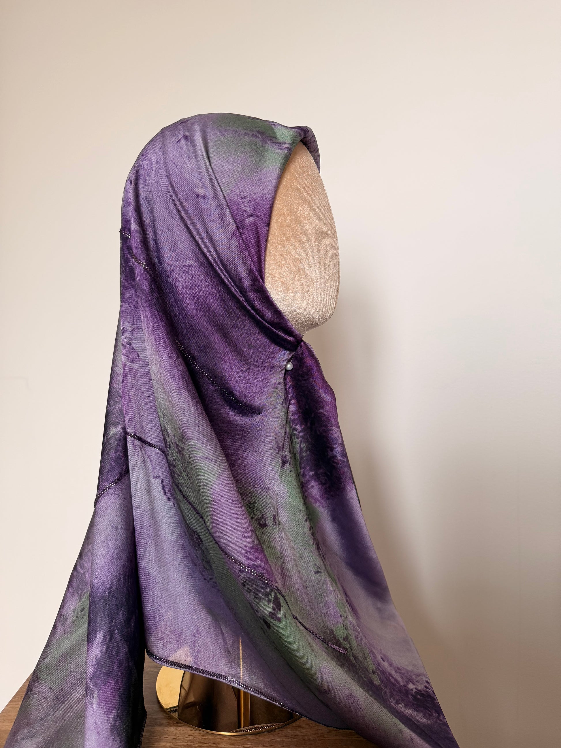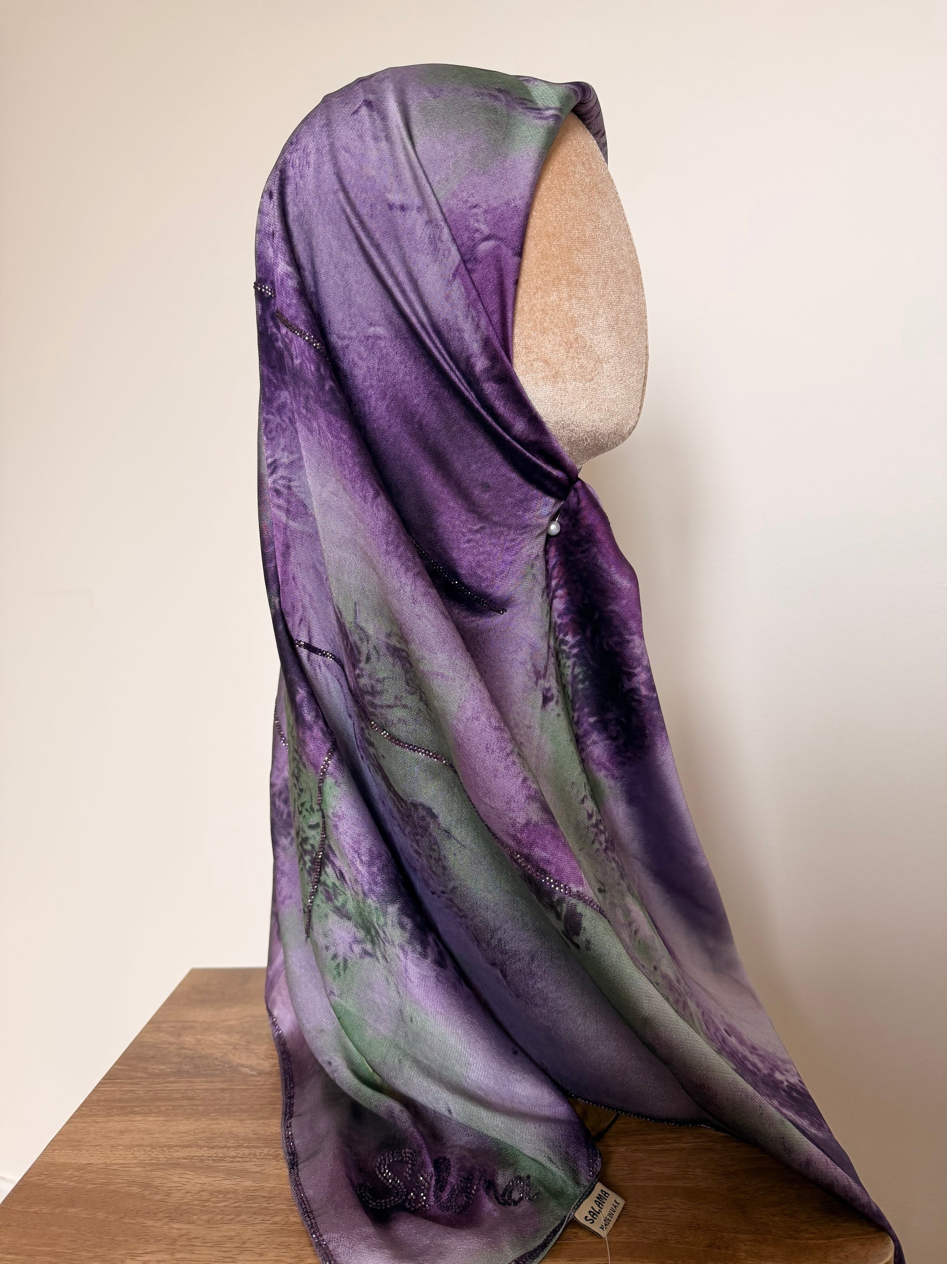 Les foulards sont délicatement ornés de strass, subtilement disposés pour sublimer chaque modèle.
