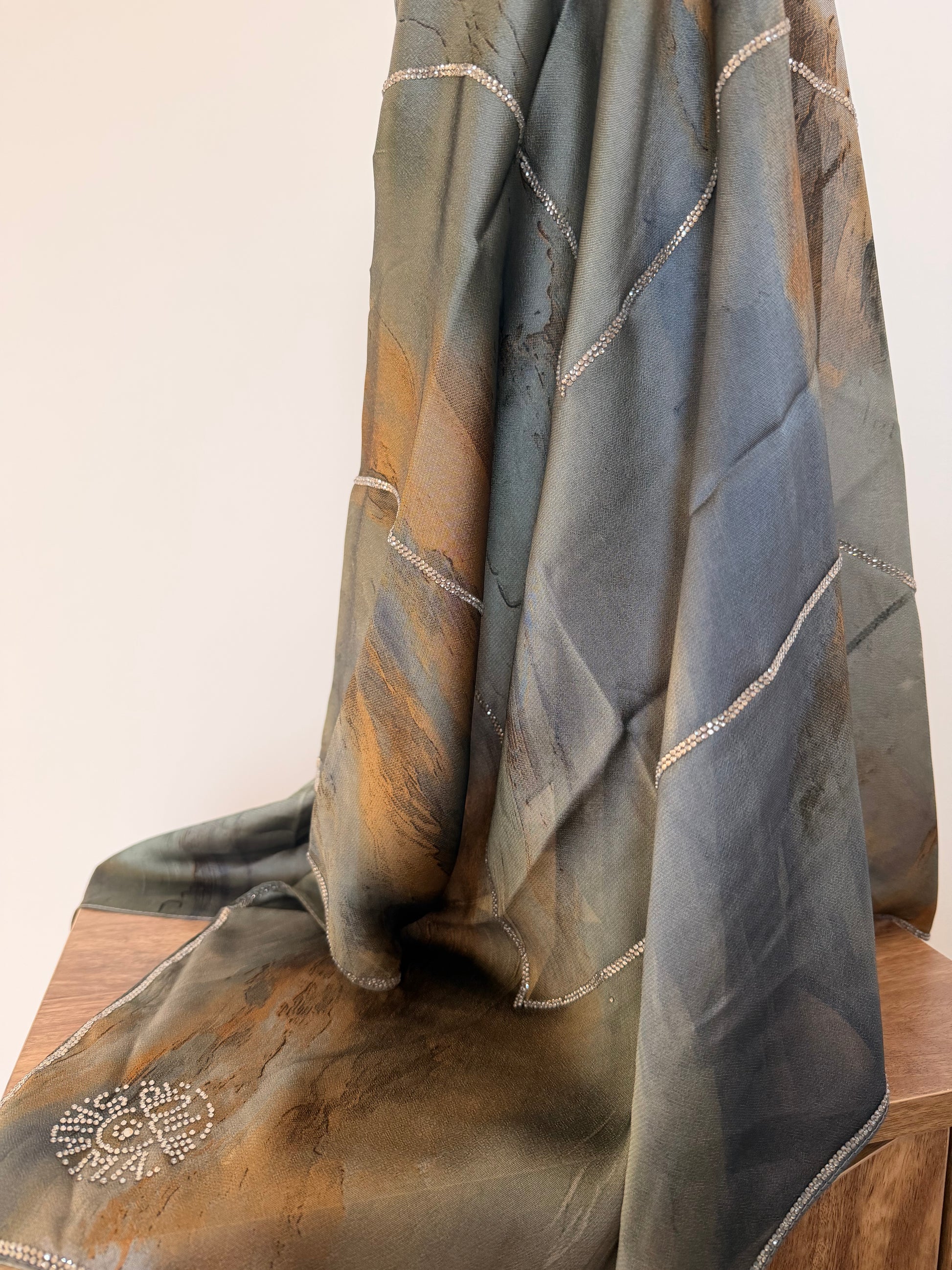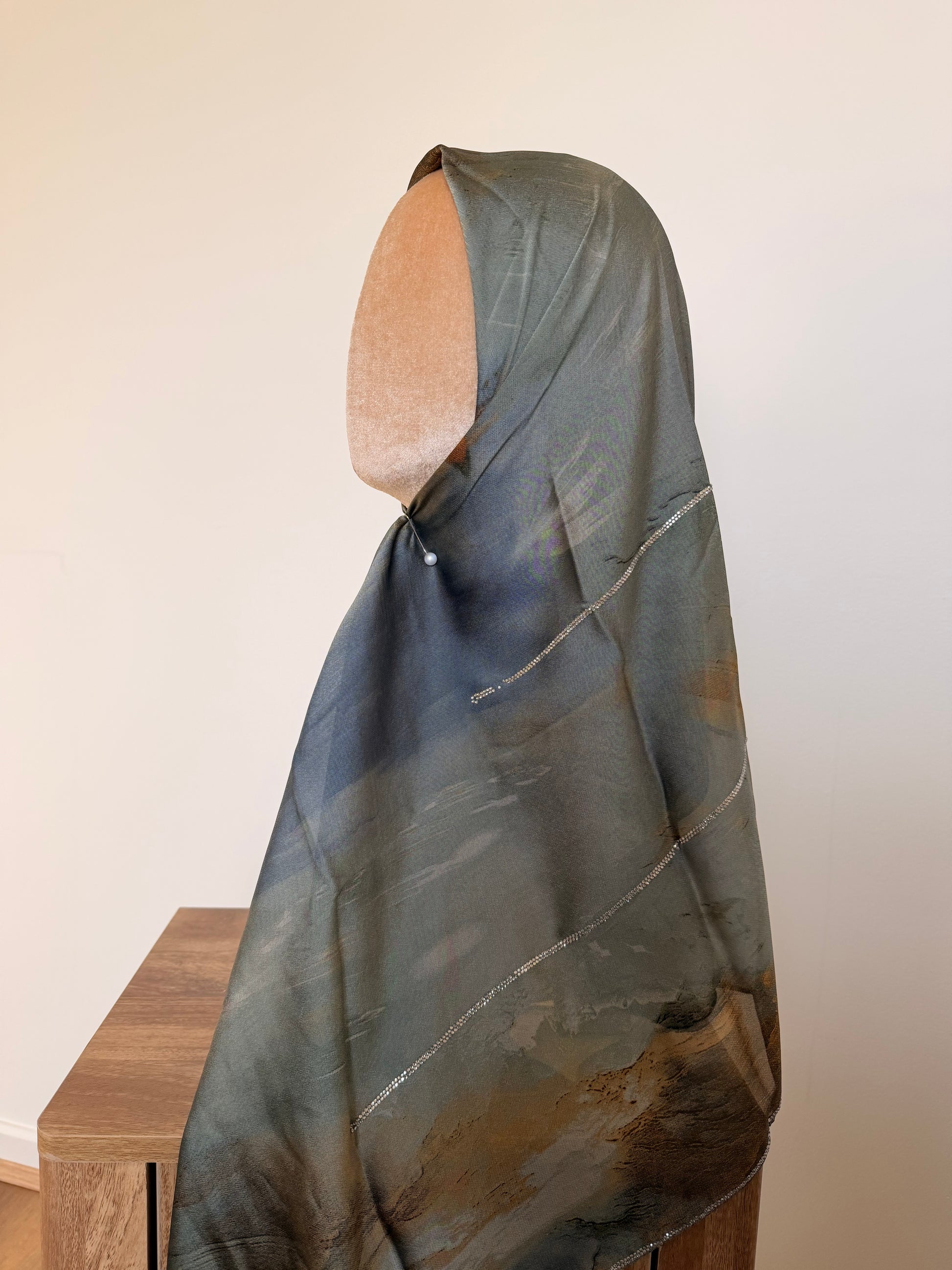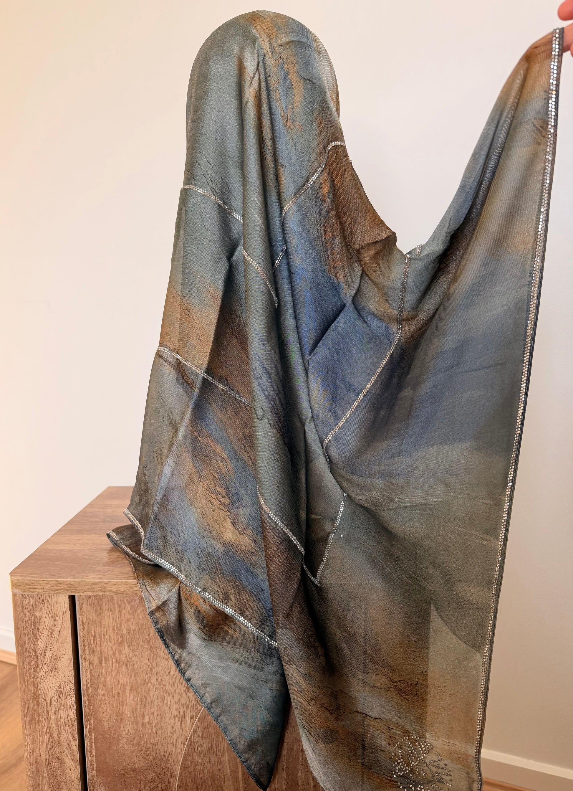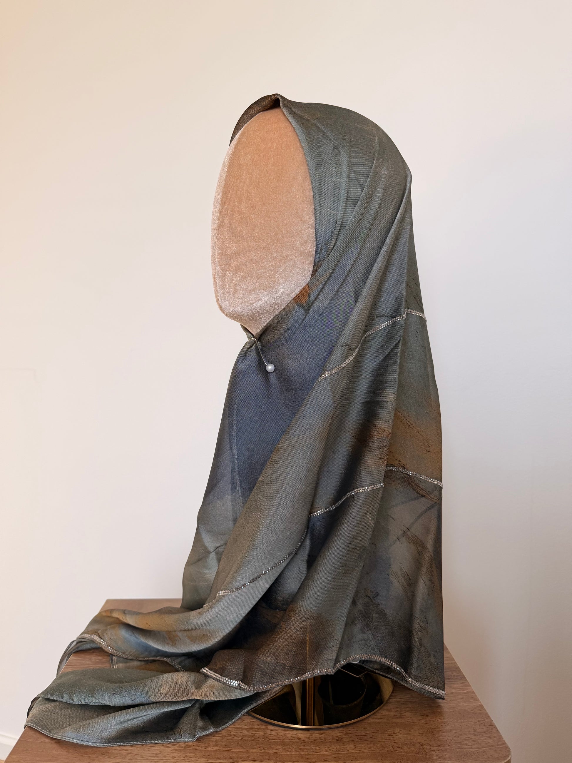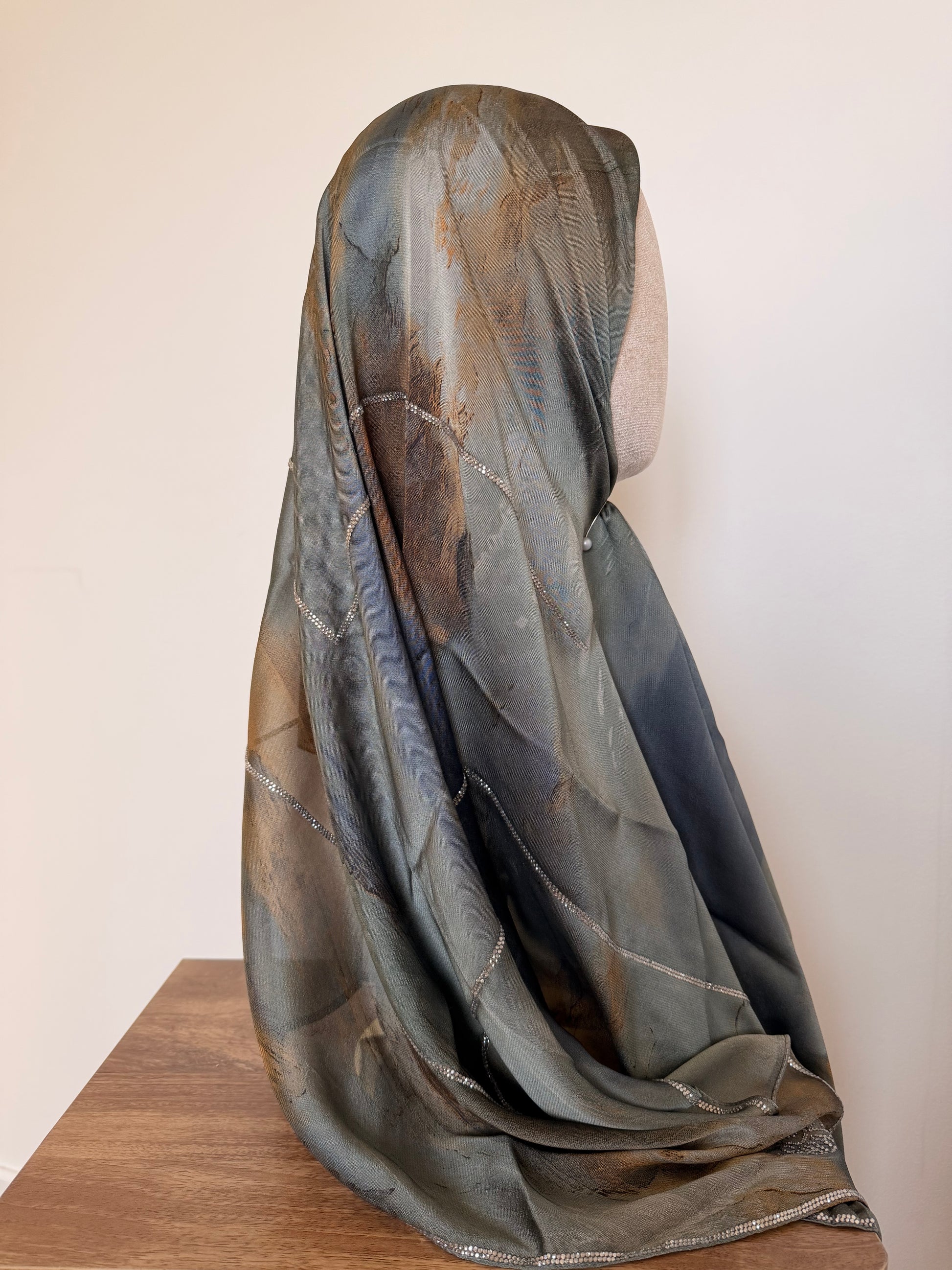 Les foulards sont délicatement ornés de strass, subtilement disposés pour sublimer chaque modèle.
