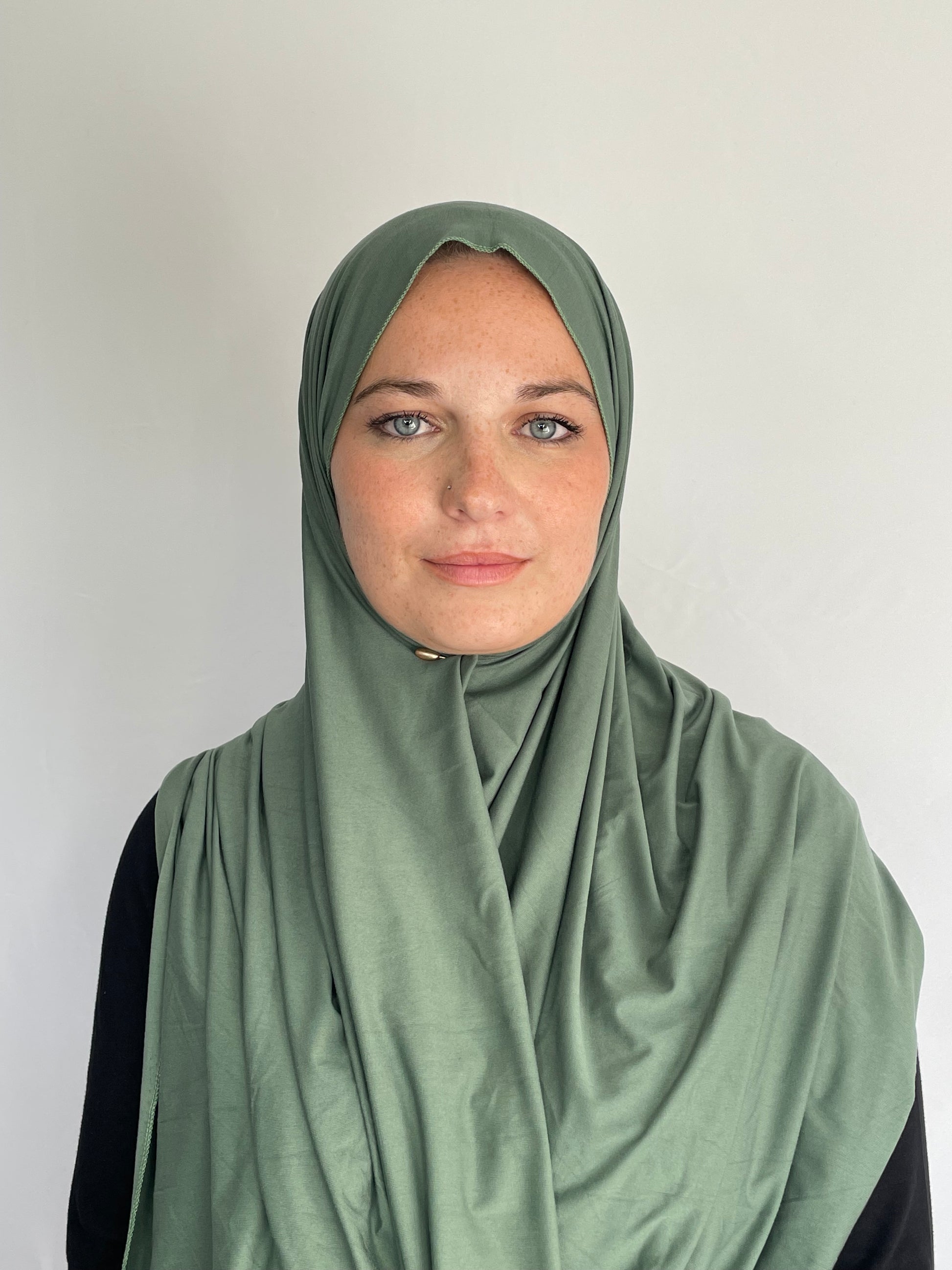 Les couleurs sont parfaitement assorties : chaque teinte porte le même nom car elle correspond exactement entre les cagoules, les hijabs en jersey du Caucase et les bonnets cache-dessous de menton. Une harmonie visuelle garantie grâce au même jersey premium, issu du même tissage.
